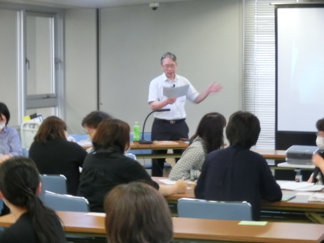 - 第1回は、絵本の読み聞かせについての基本的な知識を学びました。前半は、読み聞かせに向く絵本の選び方や読み方などについての講義でした。『しろくまちゃんのほっとけーき』(こぐま社)や『やさいのおなか』(福音館書店)などの絵本を使った実践的な内容でした。後半は受講生による絵本の読み聞かせの実習を行いました。5名ずつのグループに分かれて、全員がグループ内で読み聞かせをしました。受講生による様々な絵本の読み聞かせが行われ、会場は和やかな雰囲気に包まれました。受講生からは「読み聞かせについて知りたいことがわかった」「グループ実習でいろいろな読み聞かせを見ることができて、参考になった」と好評でした。絵本や読み聞かせの楽しさ、素晴らしさなどが体験できた研修会でした。