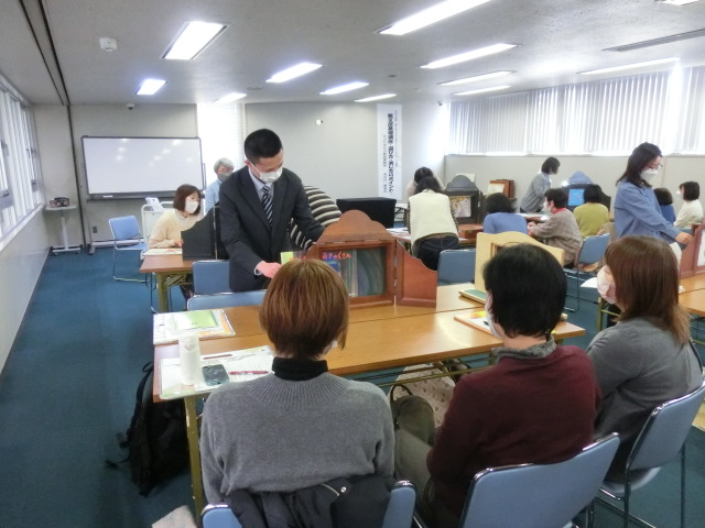 - 第2回は、紙芝居を演じる際に必要な基本的な知識などを学びました。前半は、長谷川先生による紙芝居の実演と講義、後半は、3~4名のグループに分かれて受講生全員が紙芝居を演じ合うワークショップでした。講義では、紙芝居の特長や種類、紙芝居舞台の使い方、下読みの大切さなどについて、先生がわかりやすく説明してくださいました。ワークショップでは、受講生全員が各自持参した紙芝居を紙芝居舞台を使って演じました。受講生からは「紙芝居を演じる基礎や練習方法がわかった」「先生のお話や実演がとても楽しく、紙芝居の素晴らしさを感じることができた」など好評でした。先生が実践されている乳幼児向けや高齢者向けの「おはなし会」のプログラムなどに関するお話もあり、充実した研修会となりました。