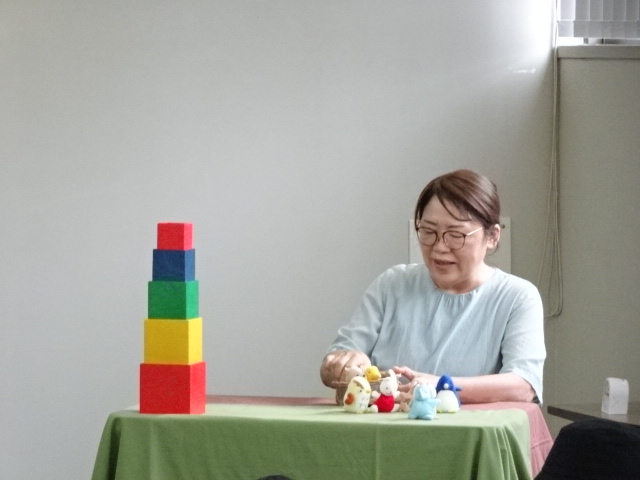 参加者を迎えるのは、お人形のついたのれん。それをくぐって部屋に入ると、ステージが用意されていて…。わくわくする様子の子どもたちが集まり、おはなし会が始まりました。