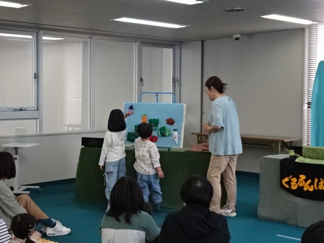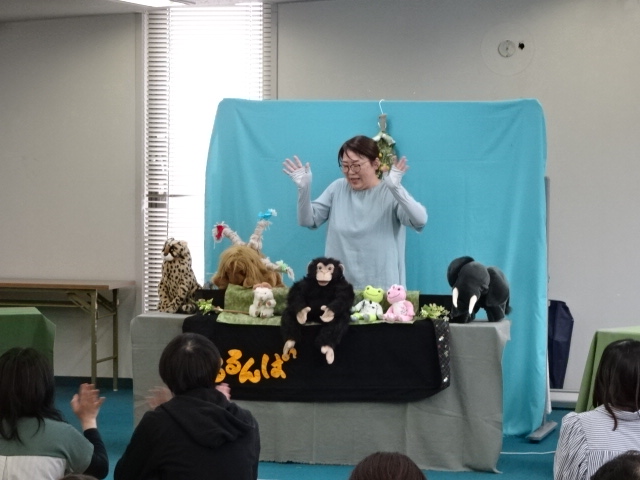 絵本『まねっこぴたっ!どうぶつ』では、絵本を見ながら親子で動物のポーズを再現しました。子どもたちは、手をふり足を伸ばしと全身を使ってポーズをとりました。人形劇「パオーン」では、動物語と人形の動きだけで表現されるお話の世界に、ハラハラしたり、思わず笑いがこぼれたり……。パネルシアター「やさいのうた」では、子どもたちも好きな野菜を発表して、パネルにはっていきました。しめくくりに、みんなで野菜の歌を歌いました。最後は人形劇「かえるのお医者さん」。ゴリラやネズミ、ライオンなどいろんな動物が、カエルのお医者さんに診察をお願いして…。次々に出てくる動物とその病状、そしてカエルのお医者さんとのやりとりに会場は大いに盛り上がりました。