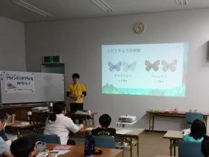 山口県子ども読書支援センターでは、毎年「こどもの読書週間」(4月23日~5月12日)に合わせて、山口県立山口博物館との共催イベントを開催しています。今年は、博物館の大森鑑能(おおもりあきたか)先生をお迎えして、県内産のチョウ類の標本観察とチョウ型のおもちゃを作成する講座「フライングバタフライを作ろう!」を実施しました。