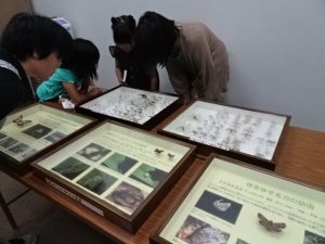 はじめに、チョウの種類やガとの違い、図鑑やインターネットでの種類の調べ方等について大森先生から教えていただきました。続いて、県内産のチョウ類の標本を、「展翅(てんし)の綺麗さ」「ラベルの情報」といった観察のポイントを踏まえながら、じっくりと観察しました。