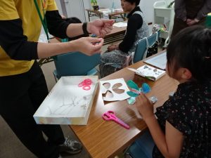 その後、チョウ型のおもちゃ作りにチャレンジしました。まず、標本や図鑑を参考にして、どの色のチョウを作るかを考えました。色が決まったら、型紙に描かれた線に合わせて色鉛筆で色を塗り、はさみで切り取ってチョウの羽を作ります。針金で作られた2種類の軸に透明なテープで羽を取りつけ、輪ゴムを使って軸を繋いで固定して完成させました。