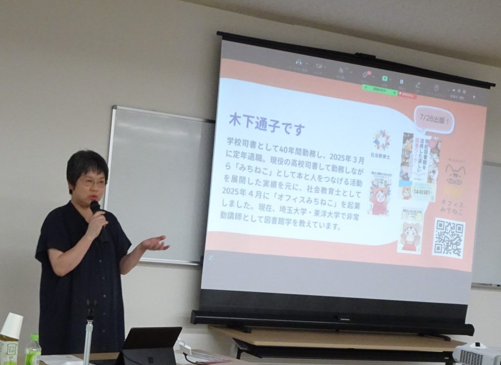 今回は、40年間埼玉県立高校の学校司書として勤務しながら、『読みたい心に火をつけろ! 学校図書館大活用術』(2017年 岩波ジュニア新書)等を執筆、「みちねこ」として本と人をつなげる活動を展開されてきた「木下通子(きのしたみちこ)」先生を講師にお招きしました。木下先生は定年退職後、社会教育士として2025年4月に「オフィスみちねこ」を起業。学校、社会教育施設、書店などを中心にビブリオバトルや読書に関するワークショップを実施するほか、YouTubeチャンネル「みちねこラジオ」で本の話について配信するなど、本と図書館の世界を広げる活動を行っておられます。
