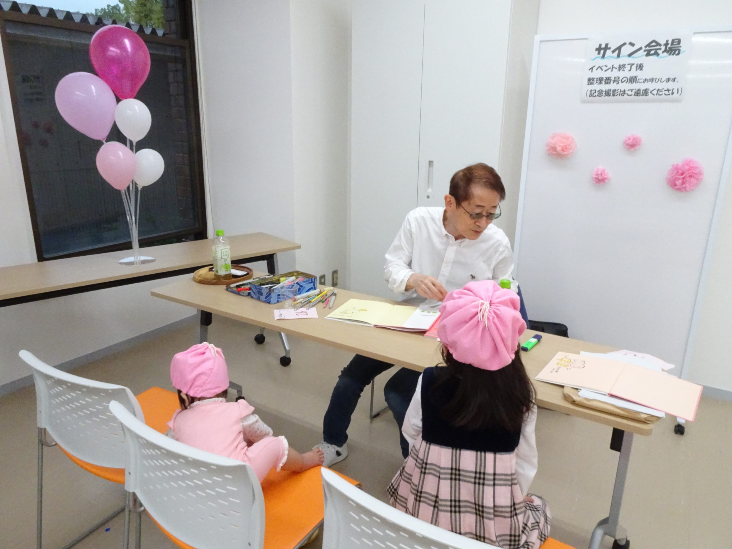 イベントの終了後は、参加者が持参した本へのサイン会も実施しました。とよたさんは、一組ずつ参加者の皆さんとお話されながら、メッセージとイラストのサインを綴られました。