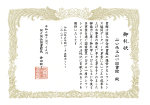令和6年度も、前年度に引き続き「レファレンス協同データベース」(通称「レファ協」)への事例登録件数が規定数を超えたため、国立国会図書館から御礼状をいただきました。