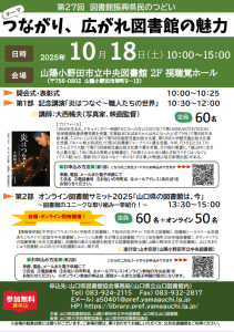 図書館振興県民のつどい(No.592:2025年10月7日) 2025年10月7日 令和7年10月18日(土曜日)に、第27回図書館振興県民のつどいを山陽小野田市立中央図書館で開催します。 写真家・映画監督である大西暢夫氏を講師にお迎えしての記念講演や、県内図書館の取り組みを紹介するオンライン図書館サミットなどを実施します。 詳しくは以下の行事案内ページをご覧ください。 【参考】第27回図書館振興県民のつどい(大西暢夫氏講演会・オンライン図書館サミット2025)を開催します。 一覧に戻る